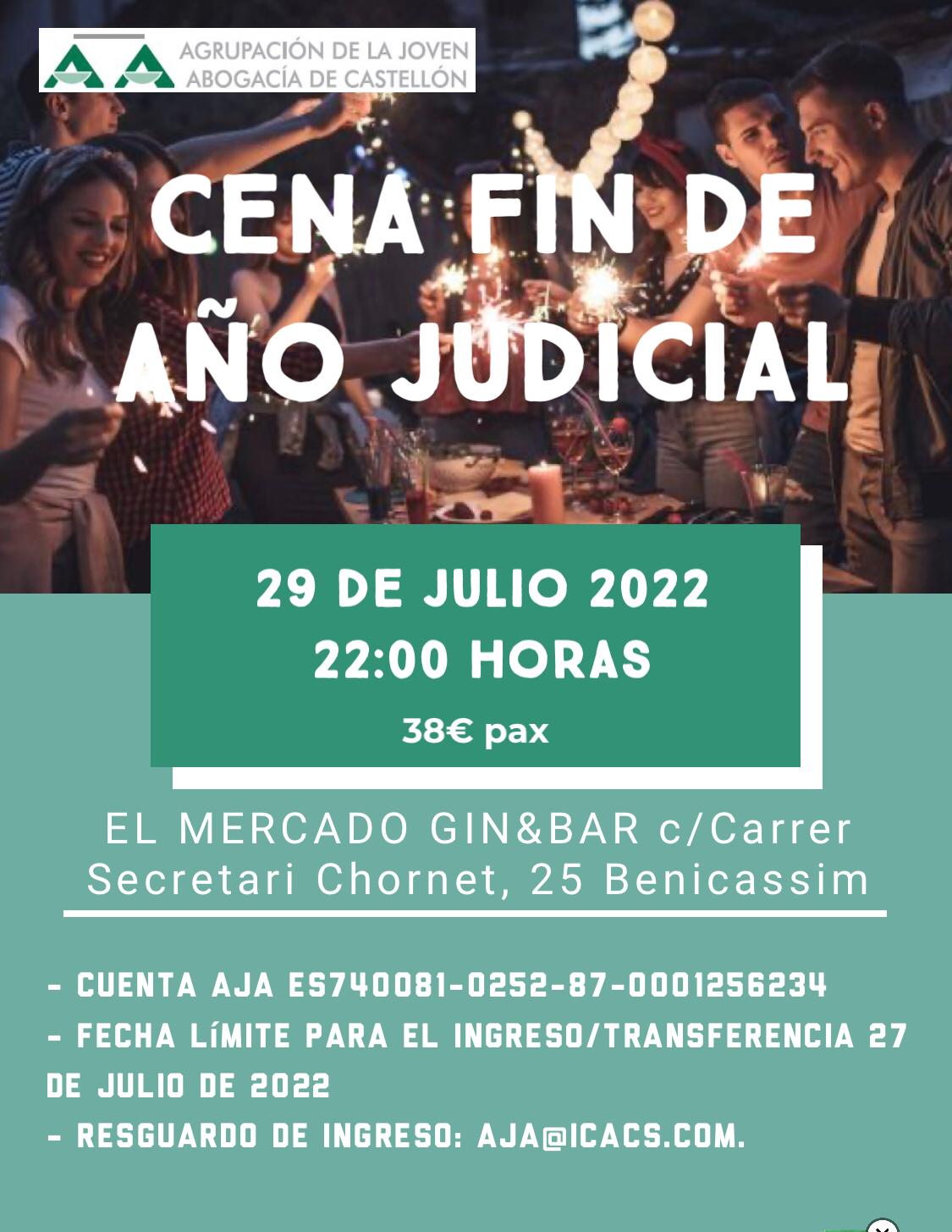 Como viene siendo habitual, desde la Agrupación de Jóvenes Abogados de Castellón, hemos organizado una cena para cerrar el año judicial y, por tanto, nos complace invitaros a la misma, que se celebrará el próximo viernes 29 de julio de 2022, en el Restaurante EL MERCADO GIN & BAR, sito en la c/ Secretari Chornet, nº 25 de Benicàssim (Castelló), a las 22 horas.