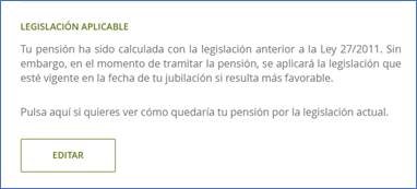 Debe tenerse en cuenta que cada vez que se modifiquen alguna de estas condiciones personales, el simulador realizará un nuevo cálculo como ocurría hasta ahora; es decir, volverá a resolver por ley antigua (si existe derecho) y aparecerá de nuevo el bloque de “legislación aplicable” para que se realice, si se desea, el cálculo por la legislación actualmente en vigor.